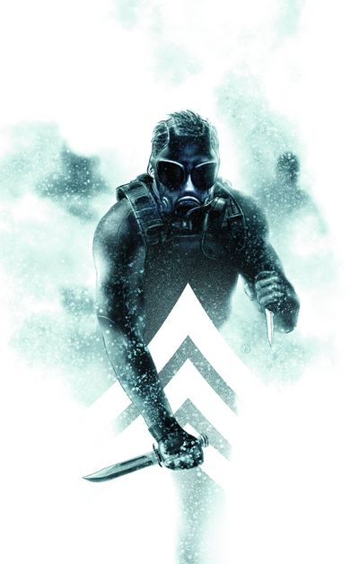 Same with this fine cover. The thing that keeps this design from just being a run of the mill badasses with knives coming at you is execution. A less is more approach and digitally painted beautifully. And adding the military ranking graphic also is a nice touch. Victor Kalvachev is scary talented and will be soaking up Eisner Awards soon enough.